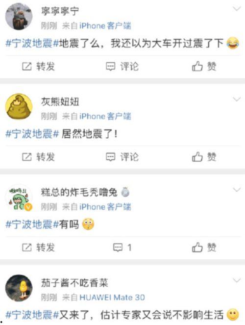地震发生时,宁波市民们纷纷拿出手机,记录下这一刻。朋友圈、微博上,地震的消息瞬间刷屏。大家纷纷留言,表达自己的感受:“地震了!快跑啊!”“家里东西都在晃,吓死我了!”“还好没大事,吓出一身冷汗!”